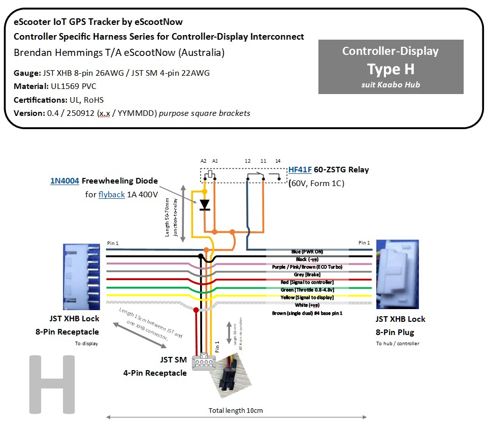 Suits 6-pin XHB Blade/Teverun Hub series (non-app versions). Supports Teverun Blade GT series (GT 2x35A40A 60V and GT+ 2x40A 60V) with Damao LCD or in-house TFT/NFC throttle displays. Also suits Teverun no-app Fighter series (TFT/NFC). Essentially all non-app Teverun / Blade scooters with Hub (Wire collection board). Design uses "singling data to display controller" rather than red power-on, as red power-on is absent on TFT/NFC (similar to Nami design). Note: blue and yellow colours are intentionally reversed as relay wire colours are adapted from type H (Kaabo Hub). Add a 45cm extension cable to mount in right hand side side channel adjacent to rear plastic tail light cover with white sticker facing outwards. |
