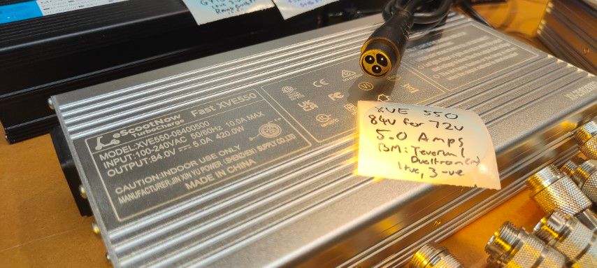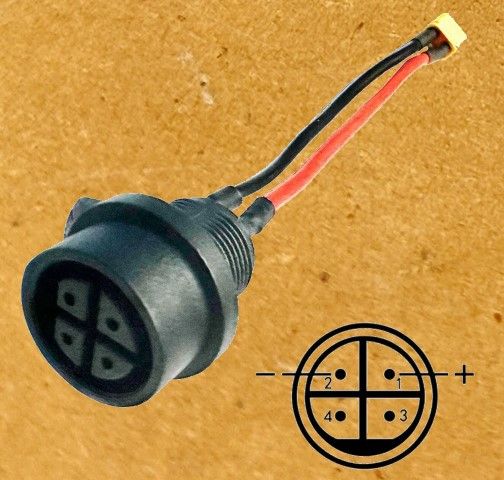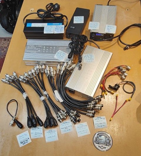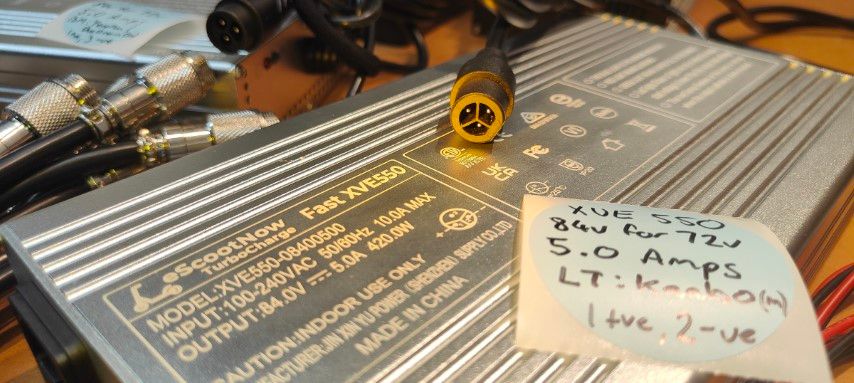 Current stocks of XVE550 (550 watt base) are provisioned with plugs for Kaabo and Teverun/Dualtron. The XVE248 semi-fast charger has the common old school GX16 3-Pin. We adapt these to the NAMI Reverse GX-16 2-pin connector with a conversion cable. We stock both the NAMI chargers and MC with NAMI Reverse GX-16 2-Pin connector, which is our recommended non-proprietary non-exposed connector.
