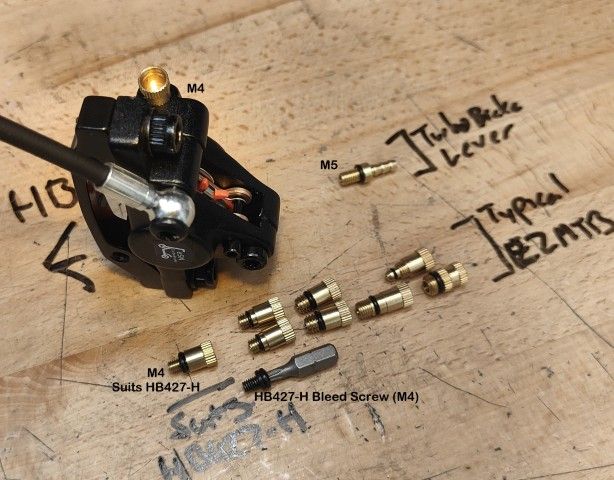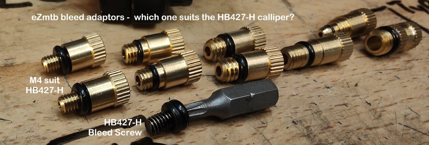 Hose terminates on the outside with a Banjo Bolt. The Banjo provides flexibility for routing of hydraulic line (hose) at expense of more points-of-failure. In contrast, the 4-piston HB427-4S calliper is without Banjo.